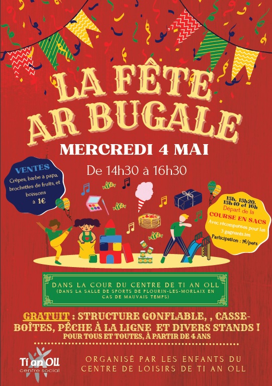 Place à la fête à partir de 14h30 dans le square derrière Ti an Oll (en cas de mauvais temps, ce sera à la salle de sports de Plourin-lès-Morlaix). C’est ouvert à tous les enfants à partir de 4 ans (même s’ils ne sont pas inscrits au Centre de Loisirs).