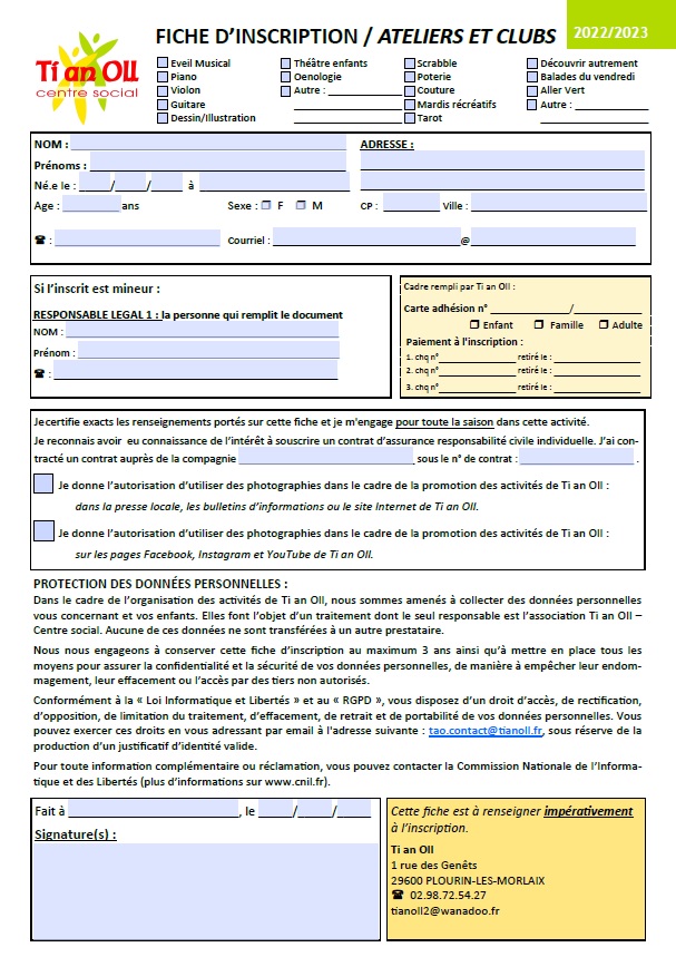 Nous prenons d’ores-et-déjà les inscriptions par mail (tao.contact@tianoll.fr) ou par téléphone (02 98 72 54 27) ou à l’accueil de Ti an Oll (1 rue des Genêts à Plourin-lès-Morlaix).