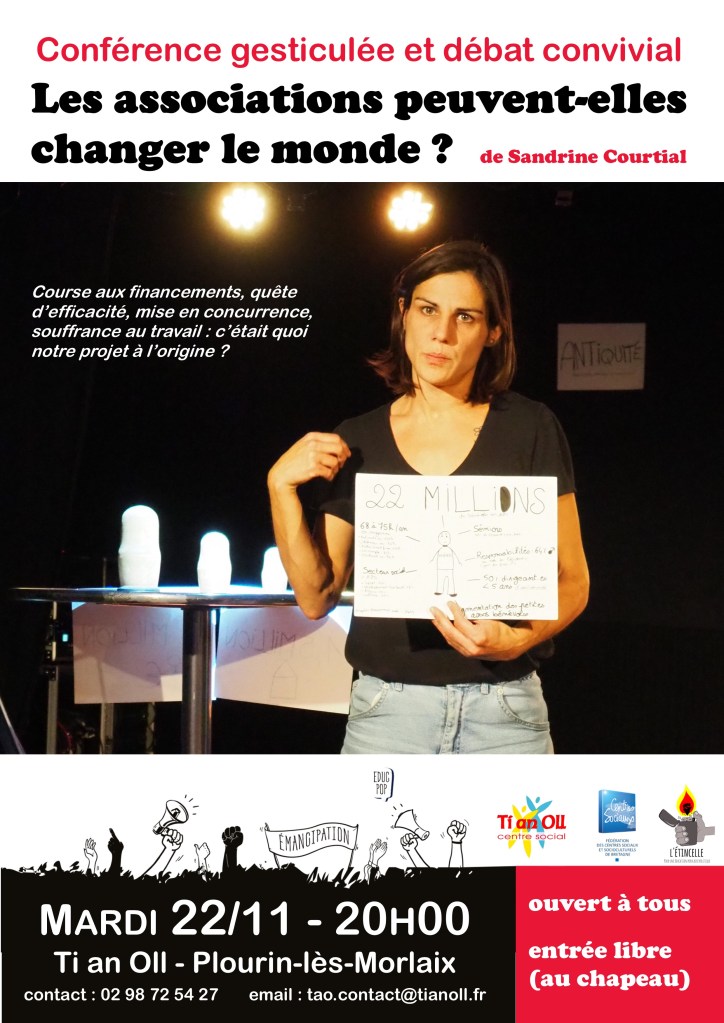 Le groupe des « Débats Citoyens » accueille Sandrine Courtial pour présenter sa conférence gesticulée « Les associations peuvent-elles changer le monde » le mardi 22 novembre à 20h à Ti an Oll. C’est ouvert à tous, en entrée libre « au chapeau » c’est à dire que chacun donne ce qu’il peut ou ce qu’il veut.