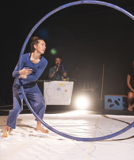 Dans cette création poétique et intimiste, la peinture et le cirque s’entremêlent et se répondent. L’artiste acrobate tournoie et virevolte grâce à sa roue Cyr et devient peintre sous nos yeux. Au plus près du public, une circassienne joue à dessiner des cercles, des figures pour former des œuvres inspirées des peintres Joan Miro et Vassili Kandinsky. Petit à petit, des formes et des courbes se dévoilent, des jaillissements de couleurs apparaissent. Au son du trombone et du tuba joués en live par un musicien, elle peint, esquisse, croque faisant apparaître courbes, étoiles et rosaces de couleurs. Une ode à l’expression artistique et au plaisir d’inventer !