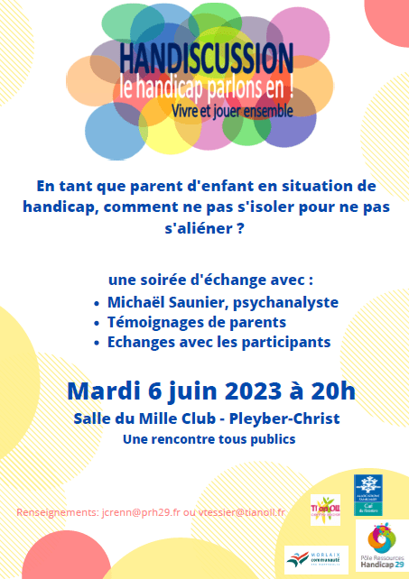 Le Pôle Ressources Handicap 29, en partenariat avec Morlaix Communauté, a le plaisir de vous inviter à la prochaine soirée Handiscussion le MARDI 6 JUIN à PLEYBER-CHRIST. La soirée sera animée par Michaël Saunier, psychanalyste et formateur à Points de Repères.