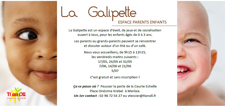 Les nouvelles dates pour l’espace La Galipette sont sorties. N’hésitez pas à venir à l’association La Courte Échelle à Morlaix les vendredis matins notés dans le flyer.